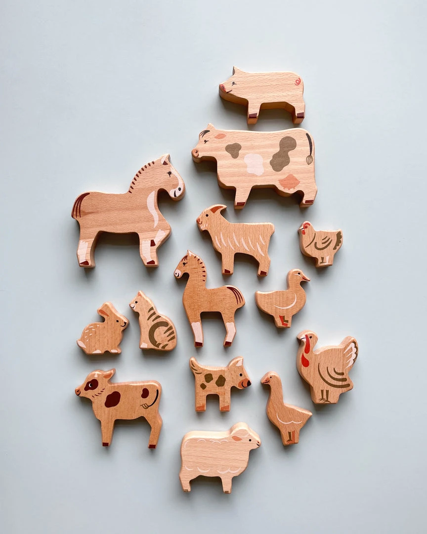 This is classic wooden set contains 14 animals: Horse, foal, goat, pig, dog, calf, cow, turkey, goose, duck, hen, sheep, rabbit, cat. Let have little farmer have a fun, nicelyÂ