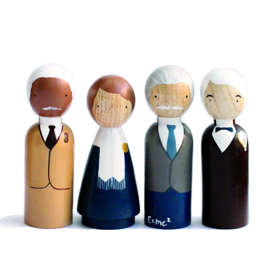 The Scientists doll set includes four 3.5″ dolls. George Washington Carver, Marie Curie, Albert Einstein, and Thomas Edison.Â