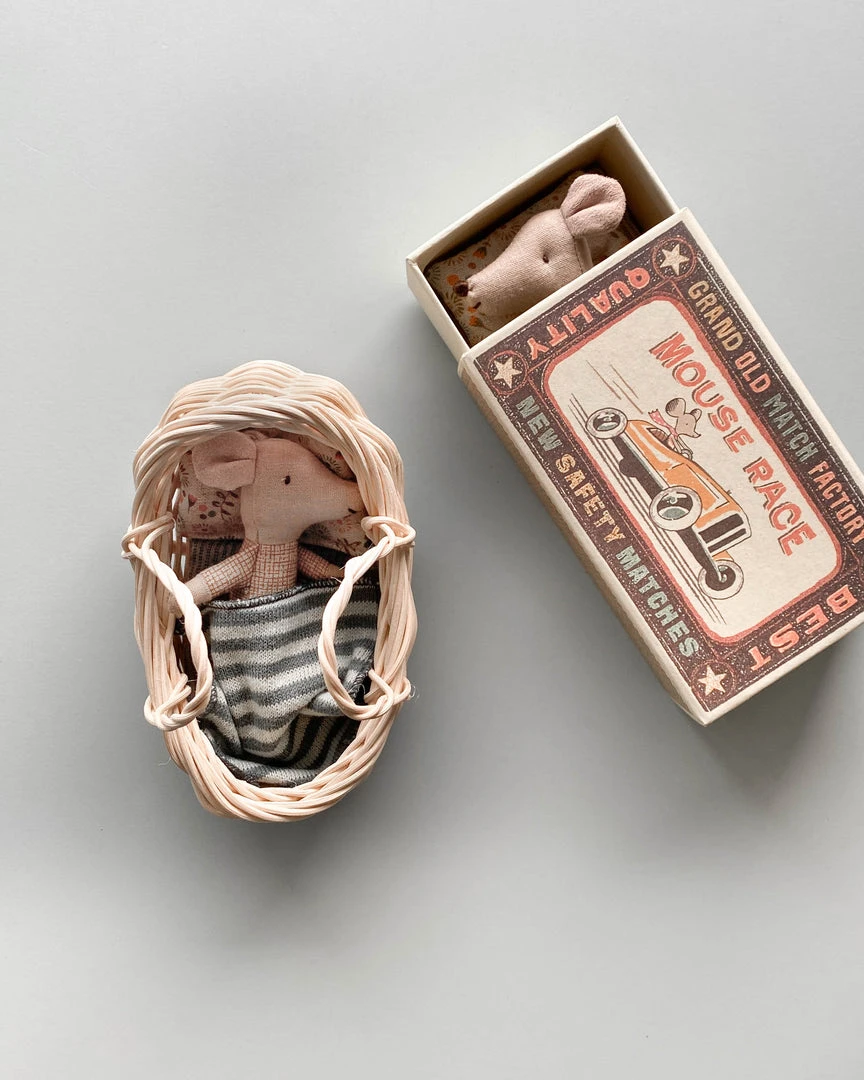 Designed to fit Maileg mice, the handmade rattan cot measures 4.7″ long and 5″ wide.