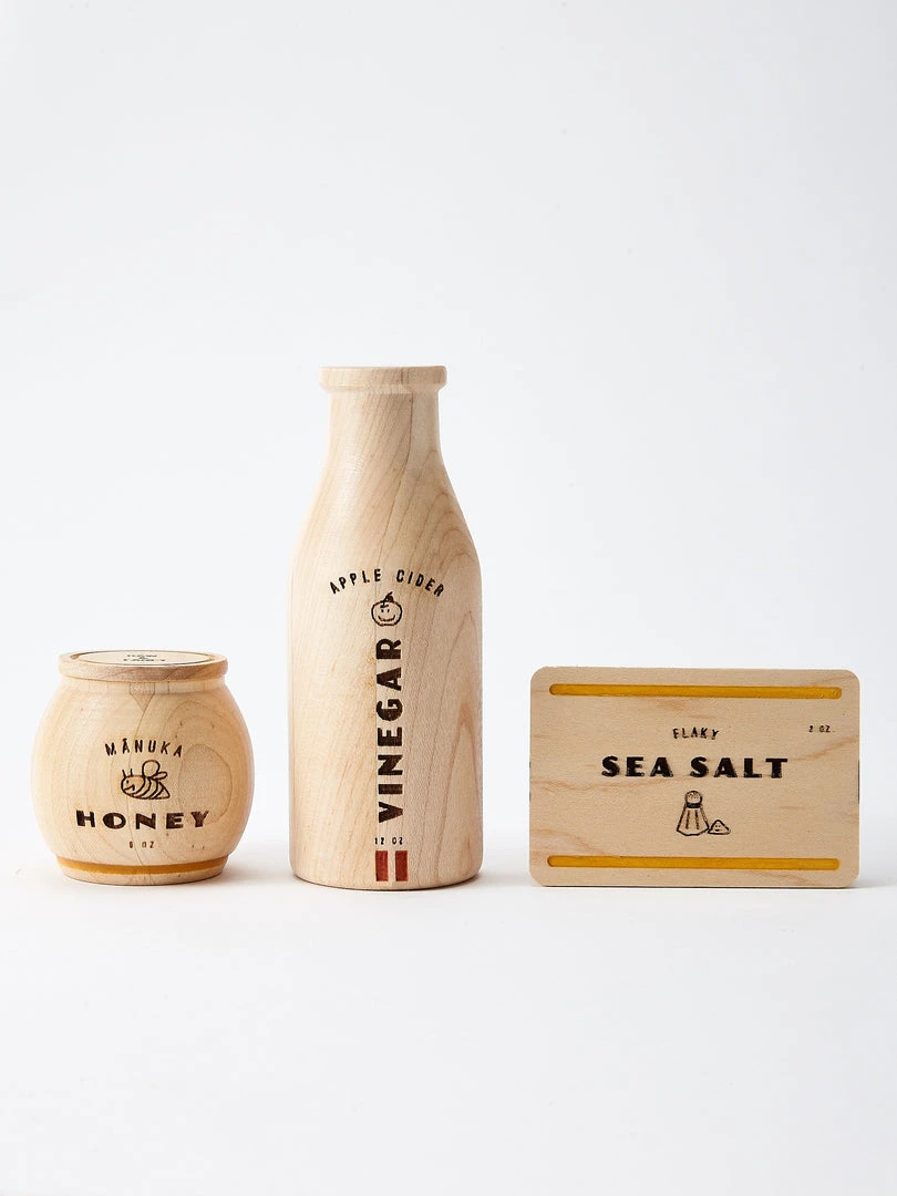 A modern take on the pantry essentials every little chef should have in their arsenal. Jar and box open for expanded play. Each set includes Apple Cider Vinegar, Manuka Honey, and Flaky Sea Salt and comes in a beautiful cotton drawstring bag.Â