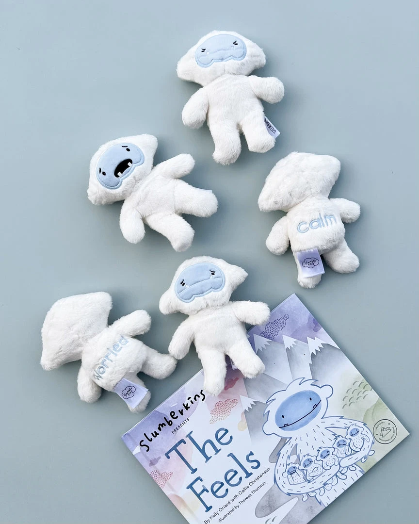 5 Mini Feels: Emotions of worried, sad, mad, scared, and calm are each represented by a mini Slumberkins Yeti.