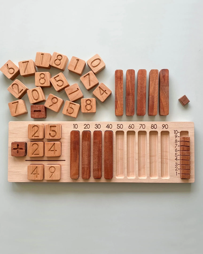 Made in USA, from beech wood and walnut wood, this math board helps little ones learn addition and subtraction in a visual way.Â