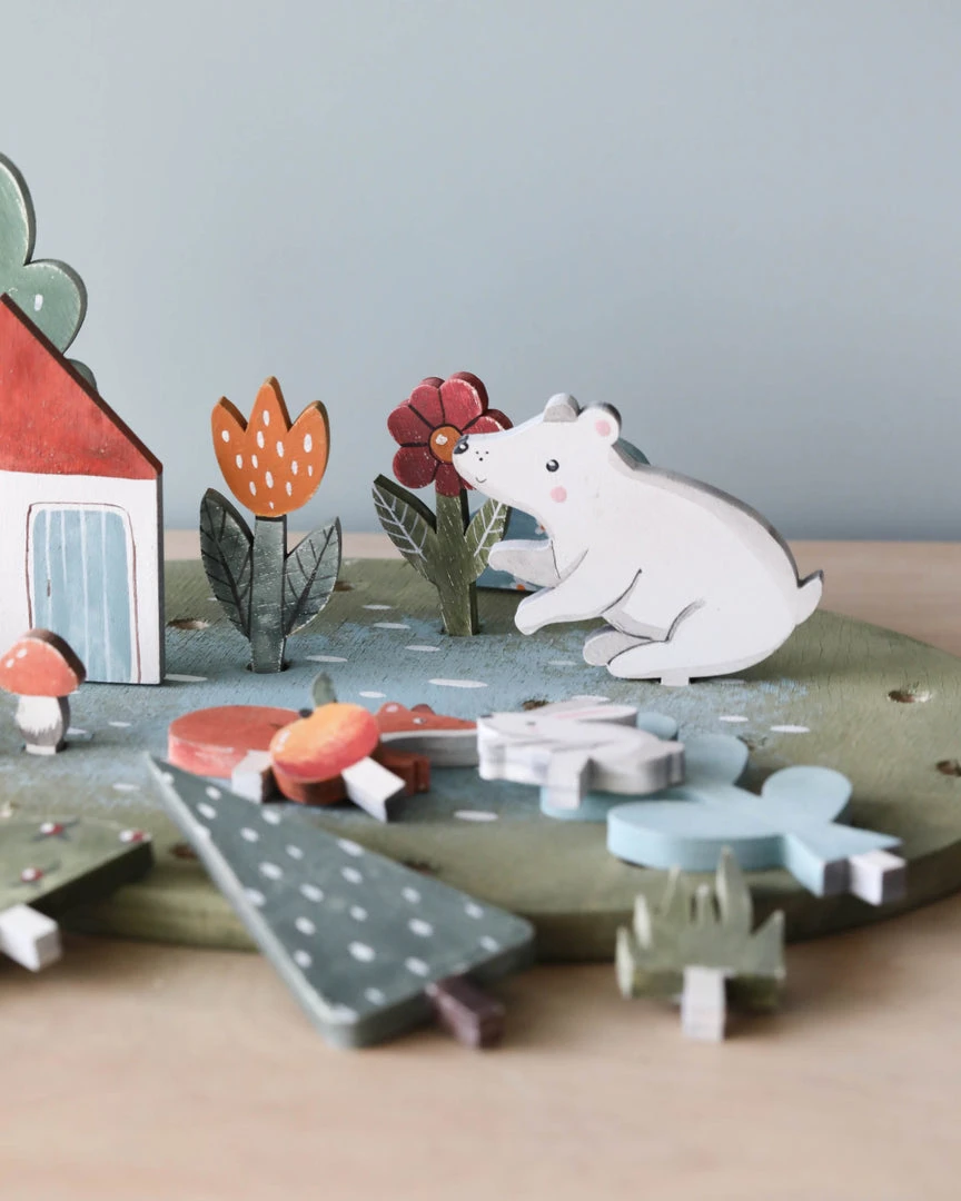 This set includes a board and 16 forest objects. The board consists of lots of little slots that will hold the play objects and providesÂ