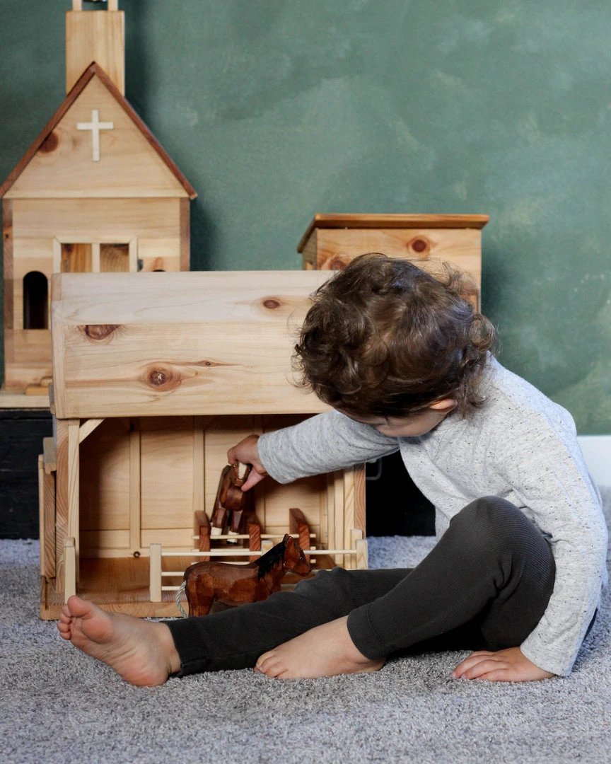Handmade in USA from pine and Douglas fir wood, and coated with food grade mineral oil. This large barn features two levels with a removable ladder, two horse stalls and a wooden fence.