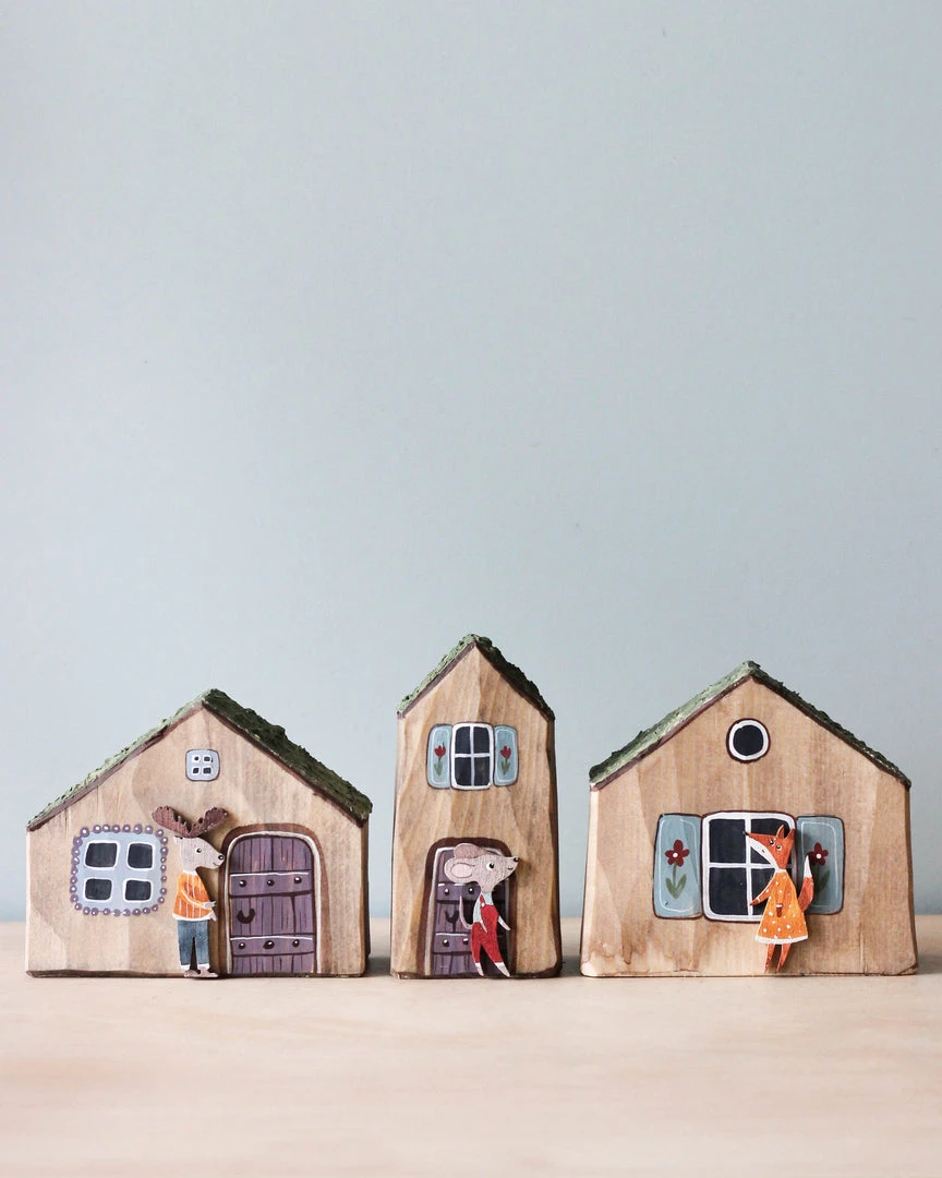 Entirely handmade and hand painted. Each set includes 3Â buildings.