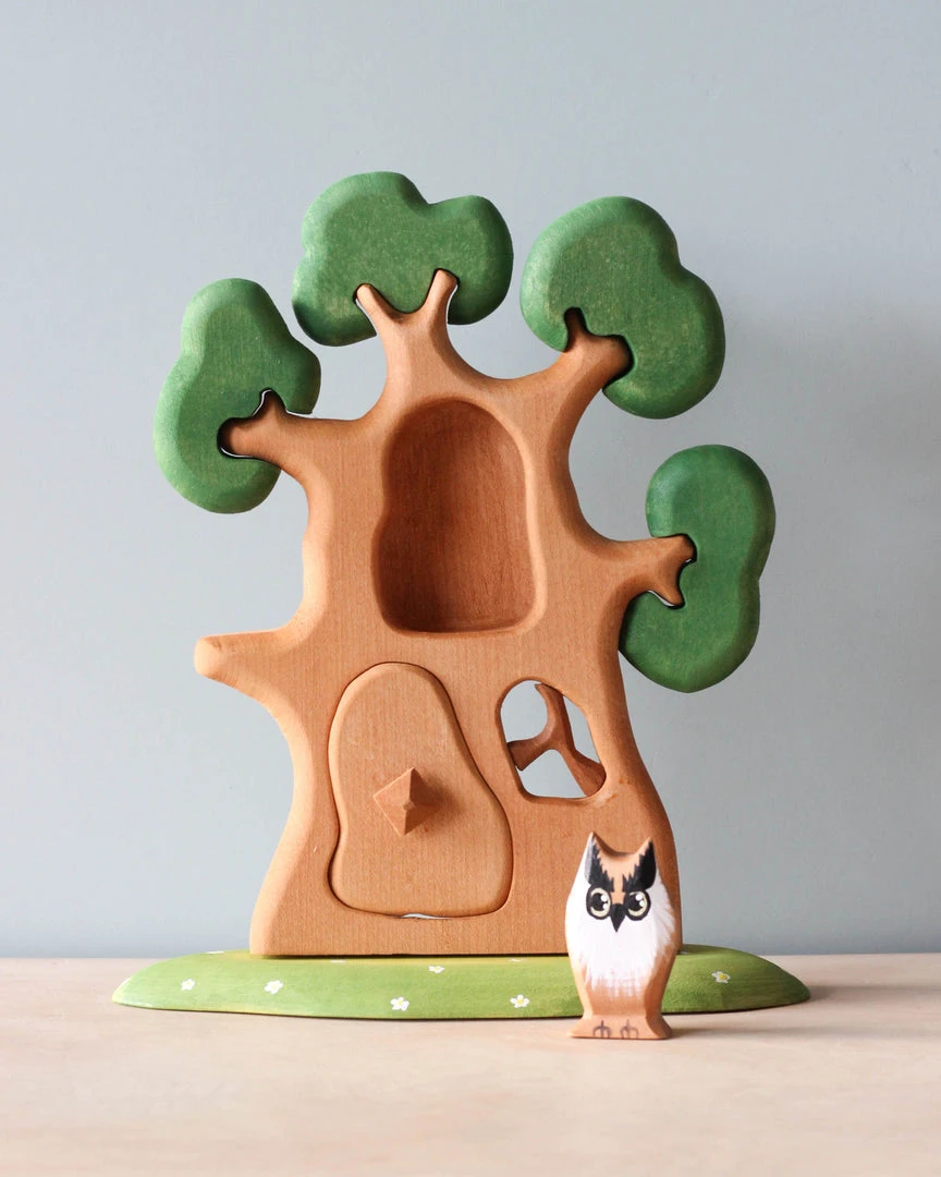 Handmade from linden wood and painted with non-toxic paint, this set includes 8 removable pieces and includes the wooden owl.